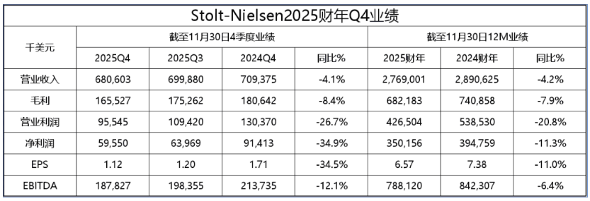2025财年第4财季(自2025年9月1日到11月30日), Stolt-Nielsen实现总收入6.8亿美元,同比减少4.1%;息税折旧摊销前利润(EBITDA)为1.9亿美元,同比下降12.1%;毛利为1.6亿美元,同比下降8.4%;营业利润为9554.5万美元,同比下降26.7%;净利润为5955.0万美元,或每股净利1.12美元,同比下降34.9%。