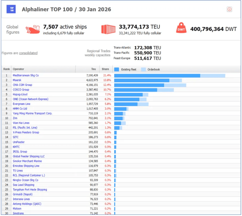 与此同时,Alphaliner数据显示,截至2026年1月30日,全球集装箱船队规模达到7507艘,运力3377.4万TEU。