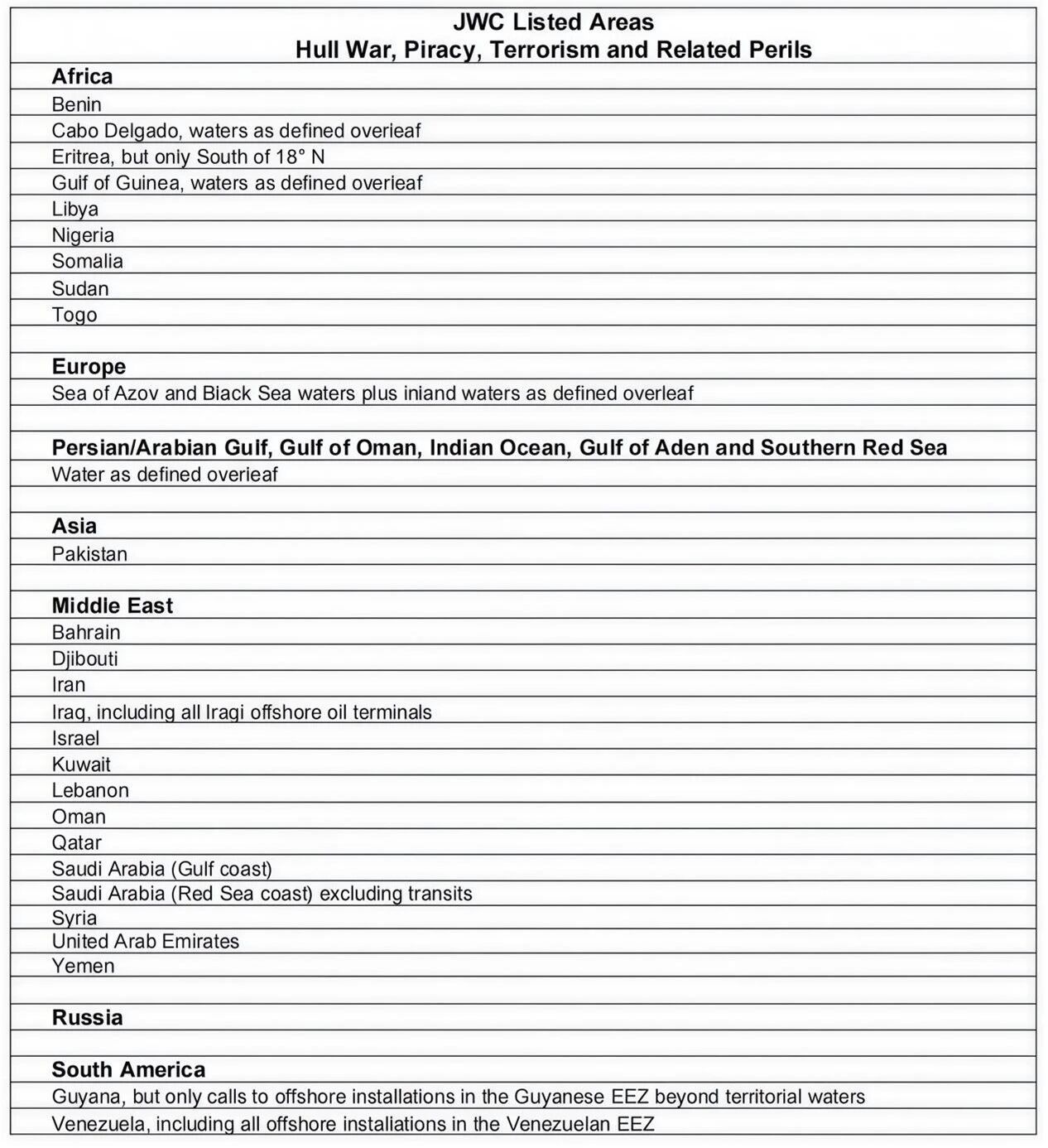 2026年3月3日,联合战争险委员会正式发布JWLA-033号除外区域清单。本次更新在JWLA-032基础上,新增巴林、吉布提、科威特、卡塔尔及阿曼全境(阿曼范围由原穆桑达姆地区扩展至全国)为除外国家;同时将原“波斯湾/阿拉伯湾、阿曼湾、印度洋、亚丁湾及红海南部”区域整合为统一除外水域,其东北/东边界线外推至巴基斯坦65°E经线,涵盖波斯湾、霍尔木兹海峡及阿曼湾相关水域。
